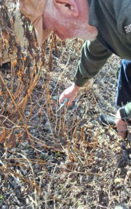Nachdem Thomas vertrocknete Stiele der Stauden abgeschnitten hat, kommen die ersten Kroküsschen zum Vorschein.