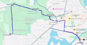 Befestigte Parkwege und Straßen, ca. 6,5-7 km. Ein Screenshot der Wanderroute ist nachstehend beigefügt.