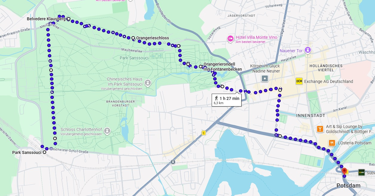 Neues Palais – Belvedere auf dem Klausberg – Drachenhaus mit Blick über den Park Sanssouci – Krimlindenallee bis zur Orangerie – Nordischer Garten – Historische Mühle – Schloss Sanssouci – Weinbergterrassen – Friedenskirche – Grünes Gitter – Brandenburger Tor – Brandenburgische Str. – Dortusstr. – Garnisonskirche – Alter Markt Potsdam – Potsdam Hfb.
