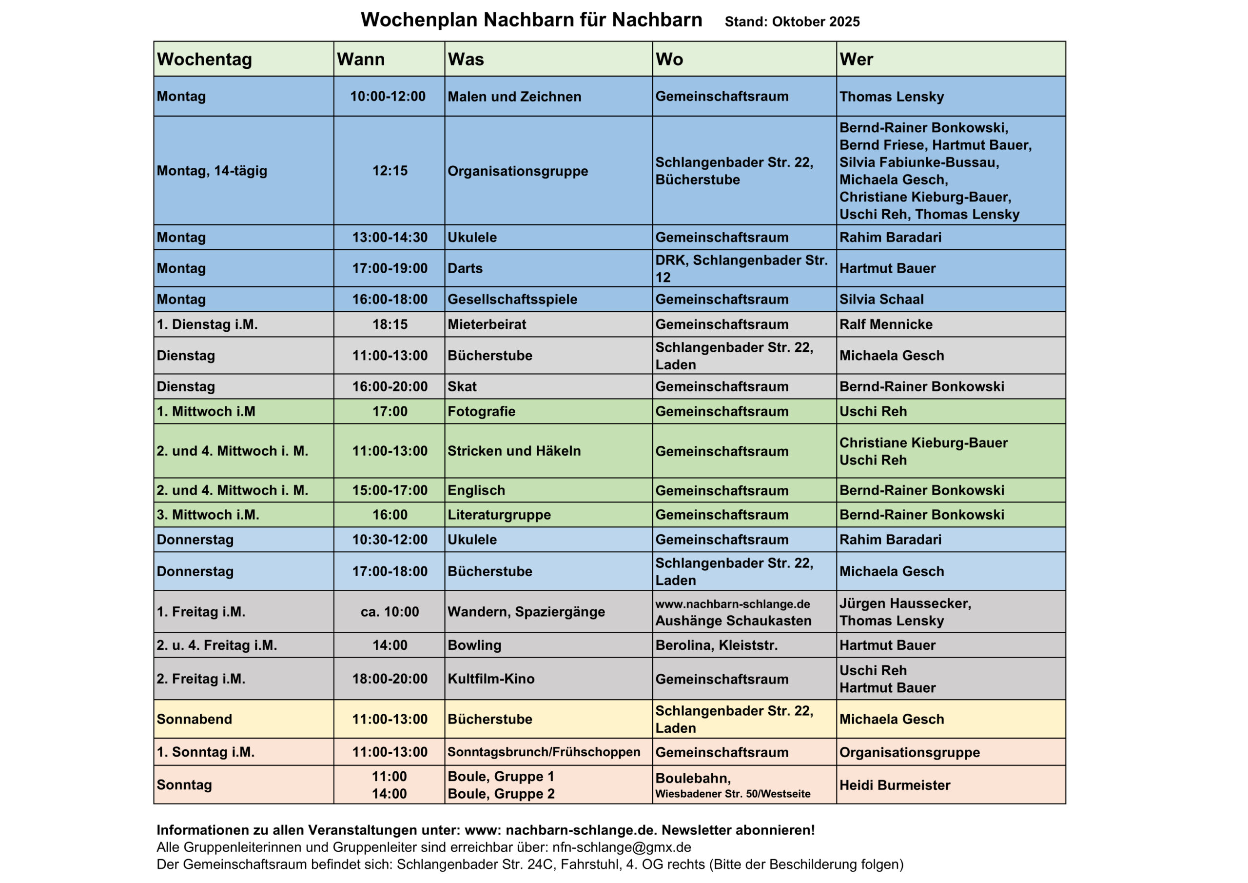 Wochenplan und Belegungsplan des Gemeinschaftsraums Nachbarn für Nachbarn, Stand: Oktober 2025 Bitte dieses Feld leer lassenNewsletter abonnieren Was gibt es Neues bei "Nachbarn für Nachbarn" Wir versprechen, dass wir keinen Spam versenden! Erfahre mehr in unserer Datenschutzerklärung Prüfe deinen Posteingang oder Spam-Ordner, um dein Abonnement zu bestätigen.